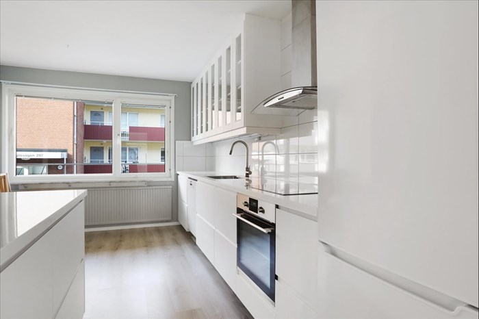 - Laminatgolv och målade tapeter. Induktionshäll, varmluftsugn (troligen 2017), spisfläkt, diskmaskin (Miele), diskho samt kyl/frys (Samsung, troligen 2010). Belysning under väggskåp.