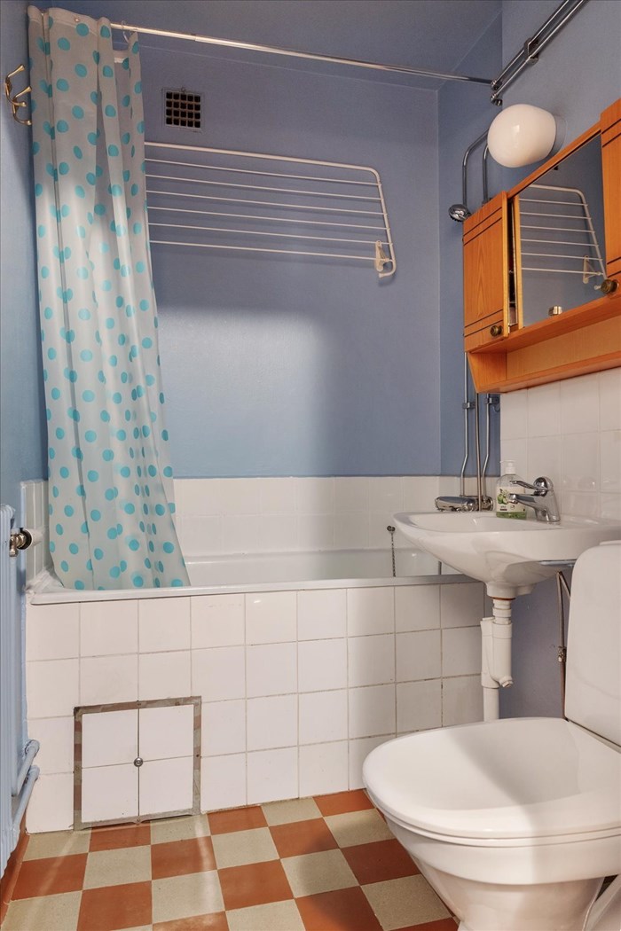 - Badrum med delvis kaklade väggar och klinkers på golv. Inbyggt badkar. Handfat, badrumsskåp samt toalettstol. Torkställning.
