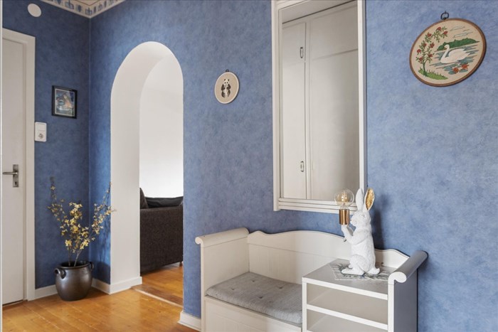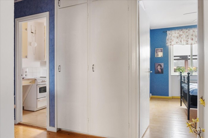 - Tapetserade väggar. Parkettgolv. Skoställ, paraplyställ och hatthylla lämnas kvar (ingår). Förvaring i tvåplatsbyggda skåp med överskåp.