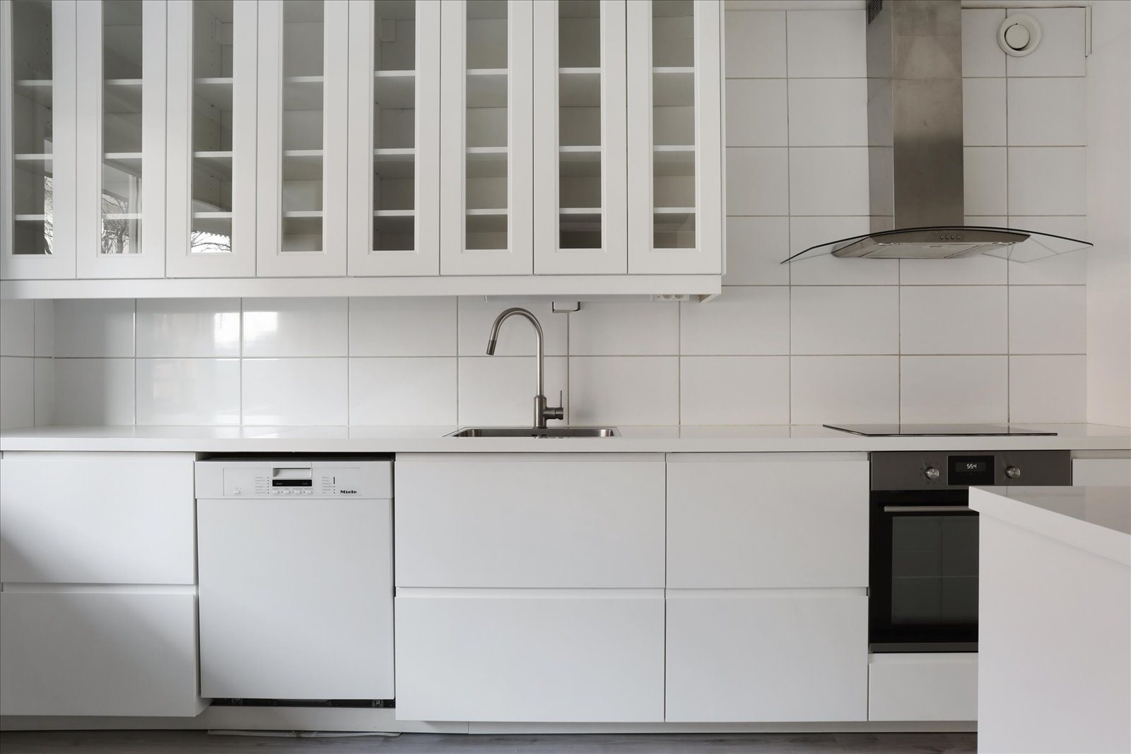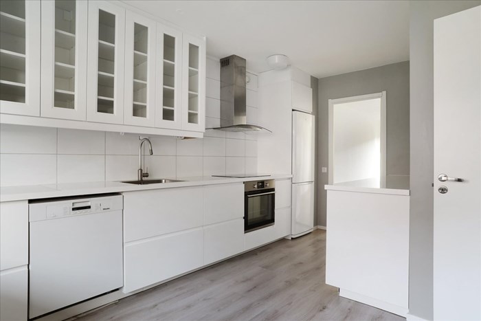 - Laminatgolv och målade tapeter. Induktionshäll, varmluftsugn (troligen 2017), spisfläkt, diskmaskin (Miele), diskho samt kyl/frys (Samsung, troligen 2010). Belysning under väggskåp.