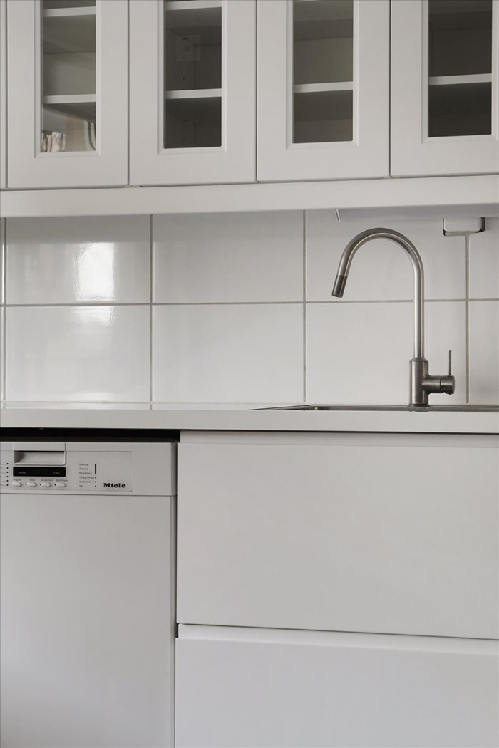 - Laminatgolv och målade väggar. Förvaringsmöjligheter på hyllplan och trådbackar.