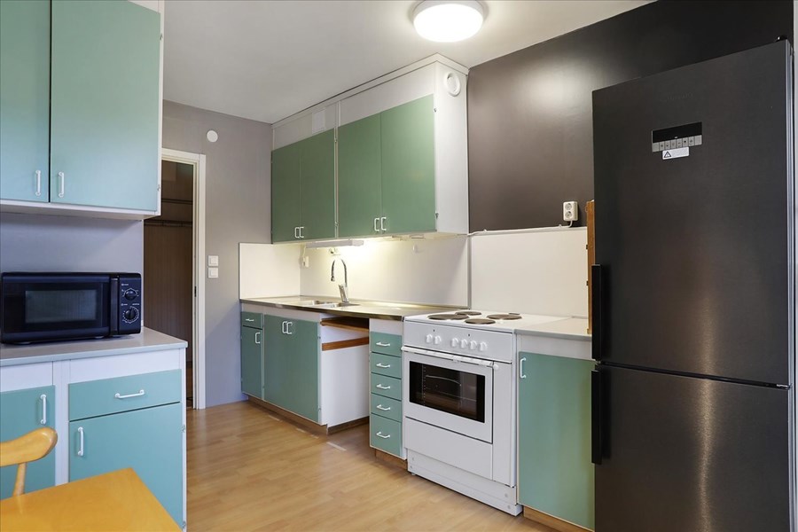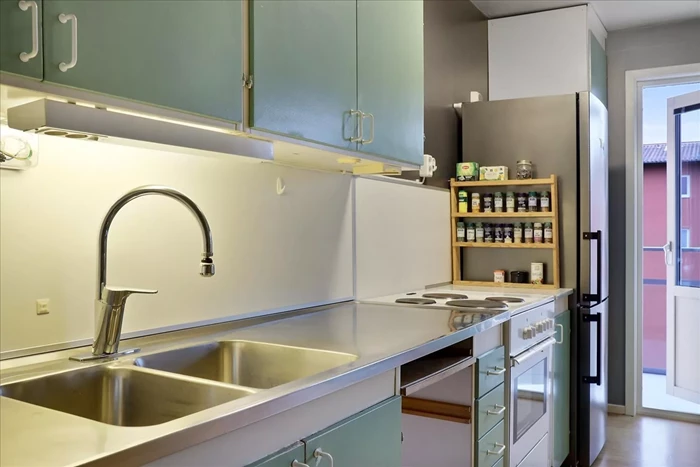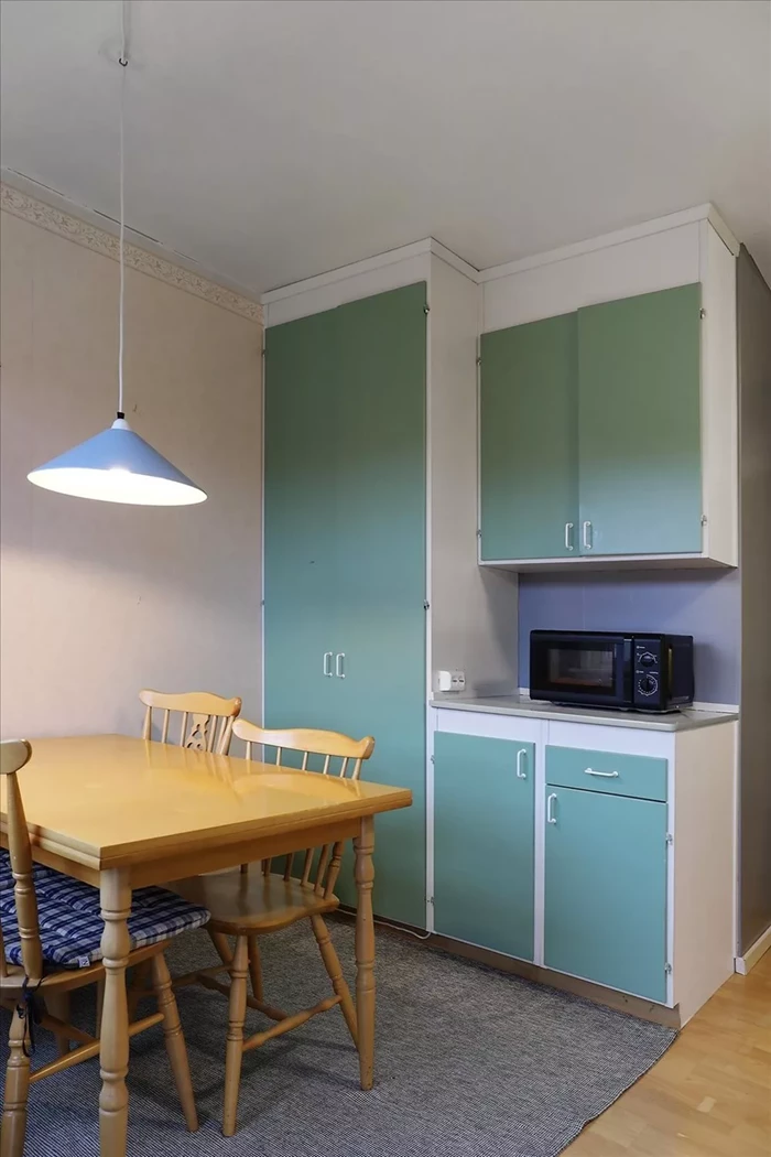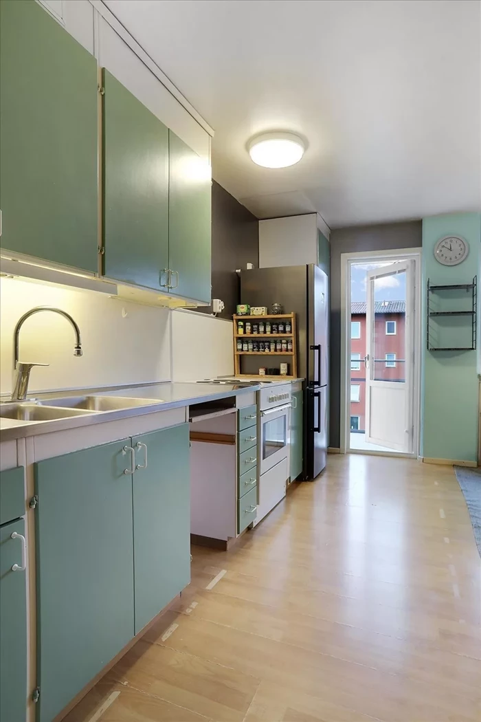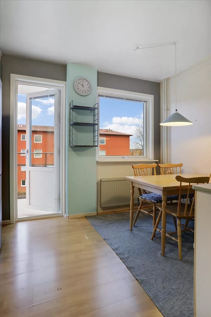 Köket erbjuder gott om förvaring och arbetsytor. Här finns plats för ett matbord, 4–5 st. stolar utöver att ni får ett härligt ljusinsläpp från fönster och balkongdörren, vilket ger rummet en ljus och harmonisk känsla. Den sociala planlösningen gör att matlagning och umgänge går hand i hand. Köket är äldre inklusive vitvarorna förutom kyl/frys som är inköpt år 2023. I kökstaket finns en gammal fuktskada (är torrt i dagsläget) från lägenheten ovanför. Detta kombinerat med gammalt kök gör att en köpare bör vara intresserad av att renovera och begärt pris är satt efter detta.