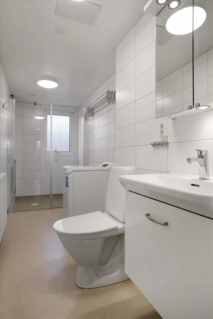 Badrummet totalrenoverades 2016 i samband med föreningens stamrenovering. Här möts du av ett snyggt, helkaklat utförande i moderna färgval. Dusch med glasväggar, tvättställning, kommod, handfat, badrumsskåp och sist men inte minst så är badrummet förberedd för tvättmaskin (befintlig tvättmaskin ingår ej, är defekt) vilket skapar en både funktionell och trivsam miljö för vardagens rutiner.