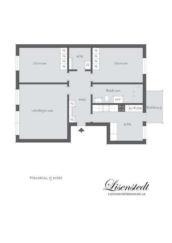 Bostaden om 81,5 kvm fördelas över tre rum och kök med fönster i två väderstreck som ger ett fantastiskt ljusflöde hela dagen. De två stora sovrummen ligger avskilt från varandra, med ett praktiskt förråd emellan – perfekt som extra förvaringsutrymme, klädkammare eller barnens lekhörna. I hallen finns dessutom ytterligare garderober som kompletterar de generösa förvaringsmöjligheterna i båda sovrummen (fyra garderober i varje).