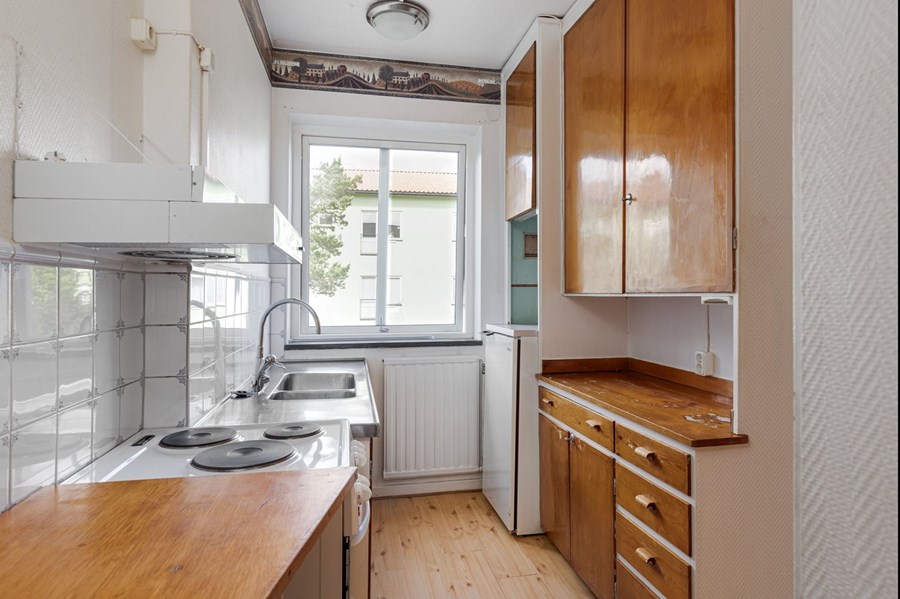 Varmt välkomna till denna renoveringsmöjlighet på andra våningen på Drottninggatan 46 B. Här finner ni en 1:a med möjlighet att bygga om den till 1,5:a och på så sätt få undan sängen. Bostaden är 40,5 kvm, har högt i tak, parkettgolv i vardagsrum och matrum, fönster åt två väderstreck och ett kök med originalköksinredning, äldre vitvaror och bevarad planlösning med kök och matplats separerat. Mellanväggen som separerar rummen har de flesta av grannarna satt igen och på så sätt skapat ett litet "sovrum" med plats för även fristående garderober. I vardagsrummet finner ni bostadens franska balkong (med ny balkongsdörr), något som sannolikt uppskattas varma sommarnätter, då ni kan lämna balkongsdörren öppen och få in behaglig svalkande bris i bostaden. Badrummet är från föreningens stambyte och håller hög standard med helkaklade väggar i smakfull kulör och samma sak om golvet, bestående av klinkers. Här finner ni även en dusch, handdukstork, kommod, badrumsskåp, toalettstol mm utöver att det är förberett för tvättmaskin (el, vatten och avlopp). I hallen finner ni förvaringsmöjligheter utöver avhängningsmöjligheter. I föreningen finns det tvättstuga, cykelrum, föreningslokal samt parkeringsplatser, sistnämnda med separat kösystem. Läget i staden är otroligt härligt och då ett ”stenkast” (ca 200 m) från händelsernas centrum, Drottningtorget (med allsång, festivaler, utomhusbio, skridskoåkning, marknader mm), och samtidigt med ett skyddat läge från stadens brus och ”vägg i vägg” med polishuset och Dahllöfs park, bestående av härligt grönområde med gott om utrymme för sommarens brännbollsspel, kubb, solning eller beachvolleyboll. Tågstationen nås inom ca 1 km promenadavstånd, Högskolan Väst inom ca 450 m och Odenhusets utbud (med bland annat Ica Matmor, restauranger, klädbutiker, Systembolag, Apotek mm) nås inom ca 500 m.