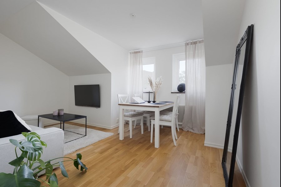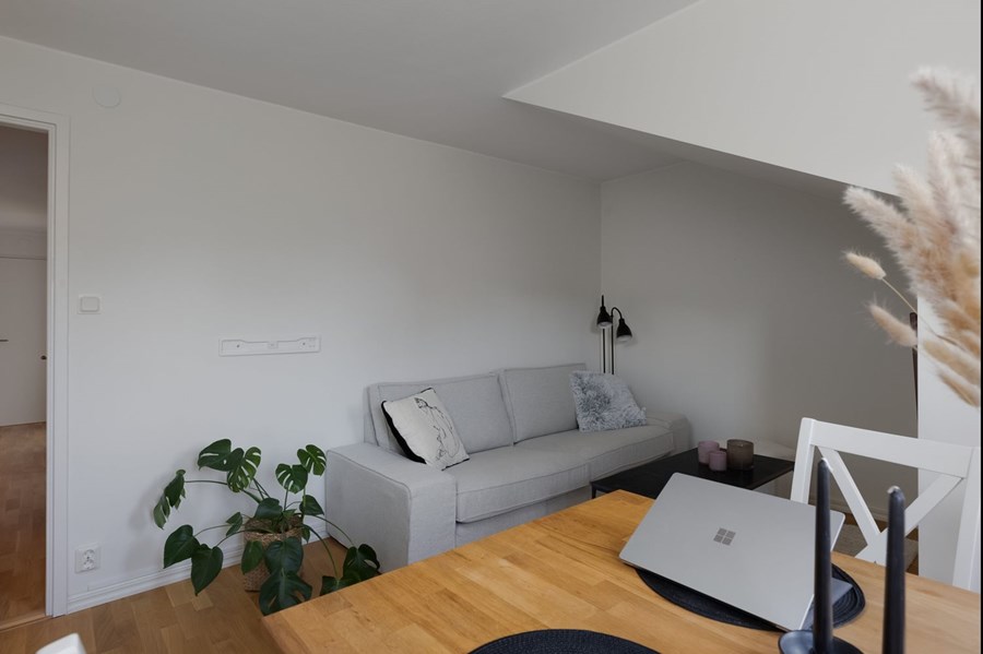 Packa väskan och flytta in! Detta hem är riktigt fräscht och när visning väl kommer ske så är den inflyttningsredo för sin nya ägare. 2021 gjordes en omfattande renovering av bostaden (ej av aktuell ägare). Ett nytt, smakfullt, kök sattes in inklusive diskmaskin, badrummet renoverades och blev helkaklat samt erbjuder golvvärme och nu även tvättmaskin (ingår). Väggarna målades och ekparkett sattes in genomgående i hela bostaden. Här finner du vindslägenhetens karaktäristiska snedtak och även ett stort skafferi i köket. Klädkammare samt inbyggda garderober som ger gott om förvaring utöver att nuvarande ägare har satt in extra garderober i hallen samt akustikpanel. Utanför ytterdörren finner du föreningens gemensamma takterrass som kommer genomgå en renovering (talas om inglasning och nytt kanalplasttak) och kommer sannolikt ge dig många minnesvärda stunder utöver en härlig utsikt över takåsar. Du kommer säkert även uppskatta att du finner varken någon granne ovanför eller i sidled utan bor själv på hela våningsplanet i aktuell port. Direkt utanför bostaden finner du även ett av bostadens två förråd.