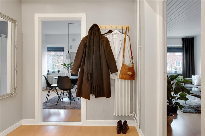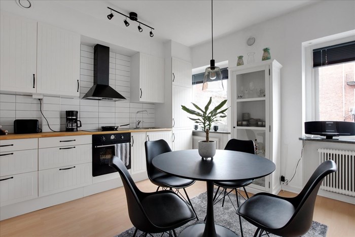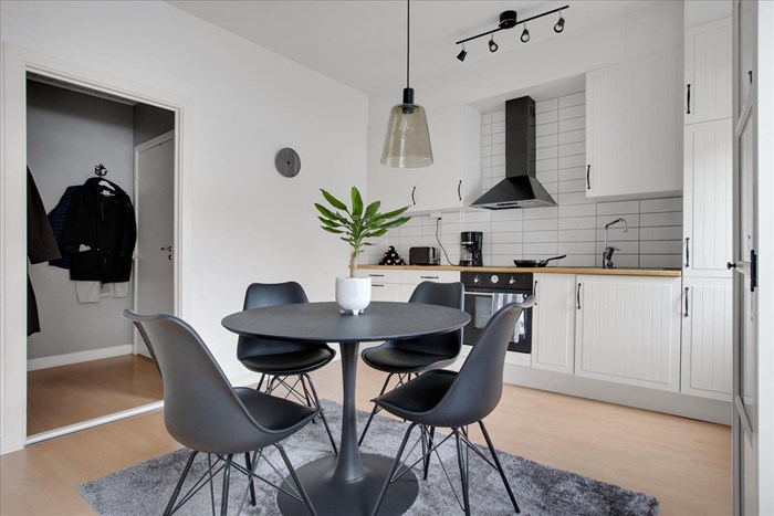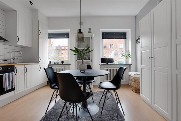 Till skillnad från många ettor erbjuder denna bostad ett riktigt rymligt kök med två fönster i fil som ger ett fint ljusinsläpp. Här finns gott om förvaring, generösa arbetsytor och plats för det runda matbordet. Köket bjuder in till både vardagsmiddag och sociala stunder med härliga vänner innan kvällens planer tar vid.