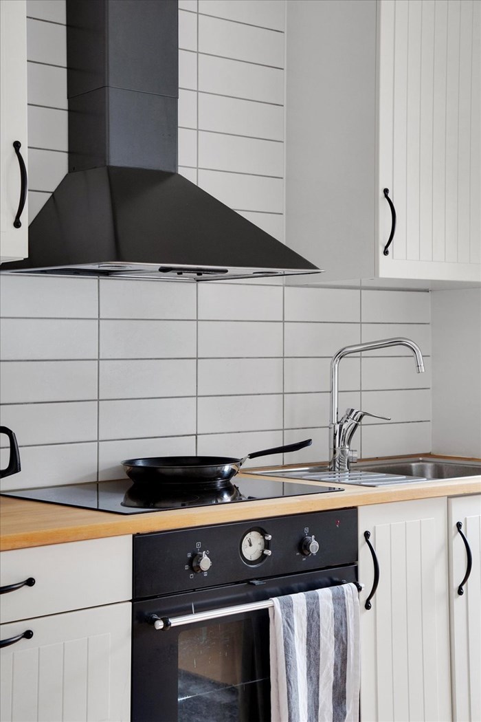 - Laminatgolv. Kaklade väggar vid köksbänk. Integrerad kyl/frys. Induktionshäll, spisfläkt samt diskho. Garderoberna ingår.