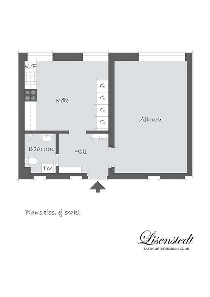- 1 rum. Boarea 40 m². Boareauppgift enligt bostadsrättsföreningen. I kontrolluppgift från föreningens förvaltare nämns endast "lägenhetsyta, ej vilken typ av yta som avses. Är boarean av vikt för en köpare så åligger det en köpare att kontrollmäta bostaden.
