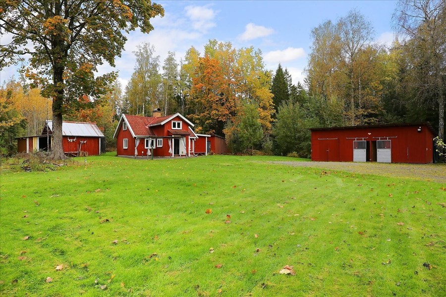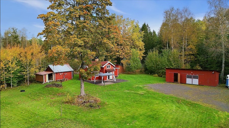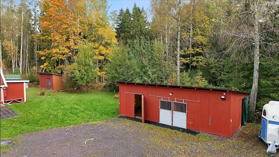 På gården finns ett välplanerat stall med tre boxar – två om ca 9 kvm och en större om ca 14 kvm med generös takhöjd upp till nock. Här finns även en uppvärmd sadelkammare och praktisk fodergång i direkt anslutning till boxarna. Förvaring löses enkelt tack vare två uthus och en vedbod, perfekta för verktyg, redskap eller foder. Komplementbyggnaderna saknar el, men erbjuder gott om möjligheter för den händige att utveckla gården vidare och säljaren har löst det med små solceller (lösöre). Befintliga hagar är skogshagar på egna marker.