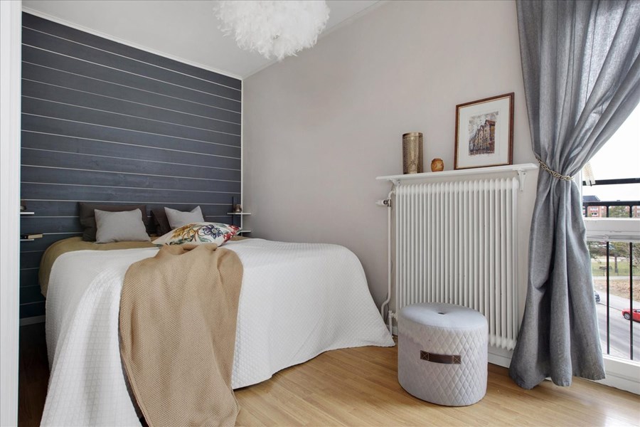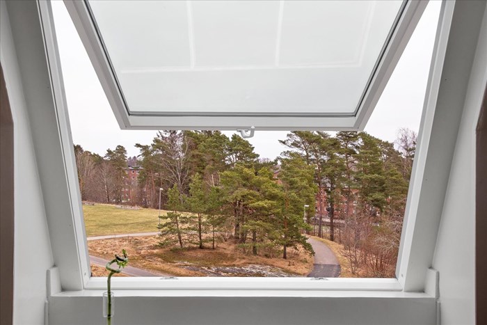 Den franska balkong ger dig möjlighet att släppa in frisk luft och njuta av varma sommarkvällar utan att behöva lämna hemmet. Ett perfekt inslag som höjer trivseln ytterligare. När det är dags att gå och lägga sig så drar du endast för mörkläggningsgardinen på vindsfönstret.