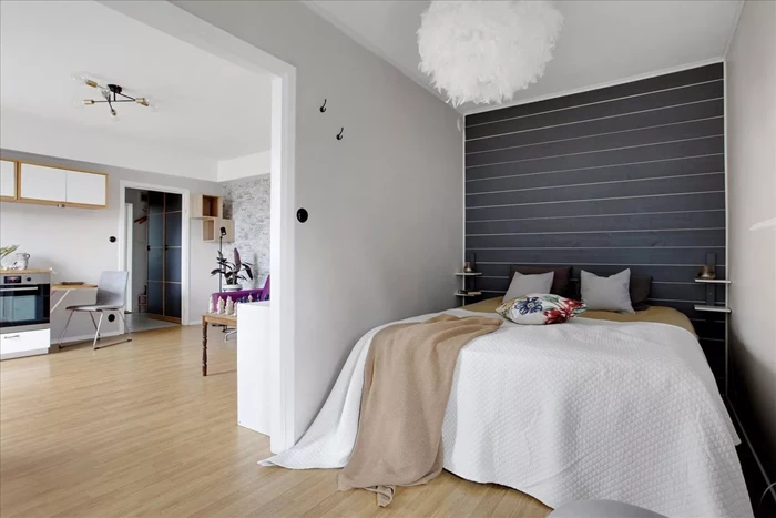 - Laminatgolv. Målad tapet. Träpanelvägg. Förvaring bakom skjutgarderobsdörrar.