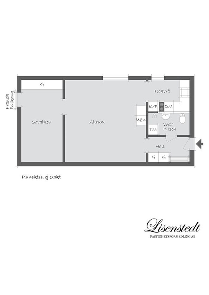 - 1 rum. Boarea 42 m². Boareauppgift enligt bostadsrättsföreningen. I kontrolluppgift från föreningens förvaltare uppges endast "lägenhetsyta" och ej vad för typ av area som syftas. Om boarean är av vikt för en köpare så uppmanas köparen att kontrollmäta bostaden innan ett förvärv.