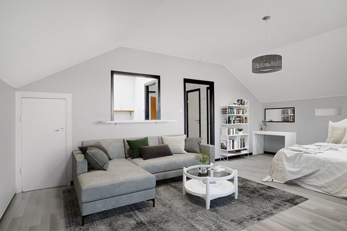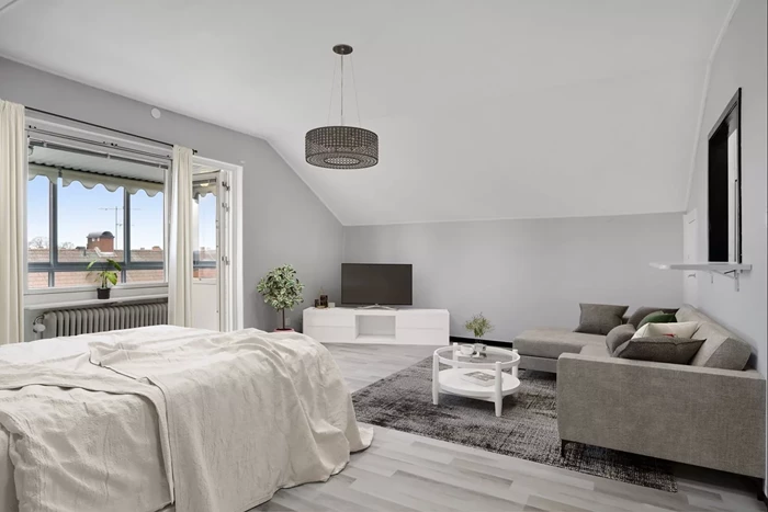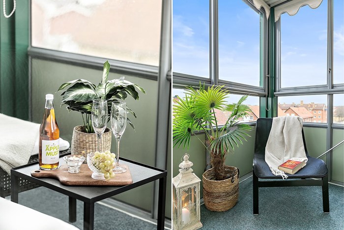 Allrummet är lättmöblerat och rymligt, med generöst ljusinsläpp och gott om utrymmme för både dubbelsäng, soffa och skrivbord utan att det känns trångt. Från rummet når du även den inglasade balkongen där du kan njuta av en svalkande dryck i soligt söderläge – en underbar plats att koppla av på året runt tack vare inglasningen! Vad sägs om att installera infravärme för att öka säsongen för underbart balkongshäng med en varm dryck i koppen om vinterhalvåret?