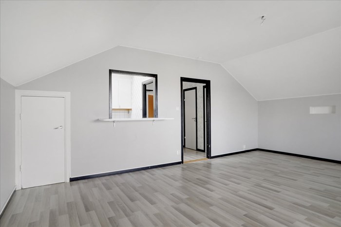 Lättmöblerat allrum med plats för dubbelsäng och mer därtill
