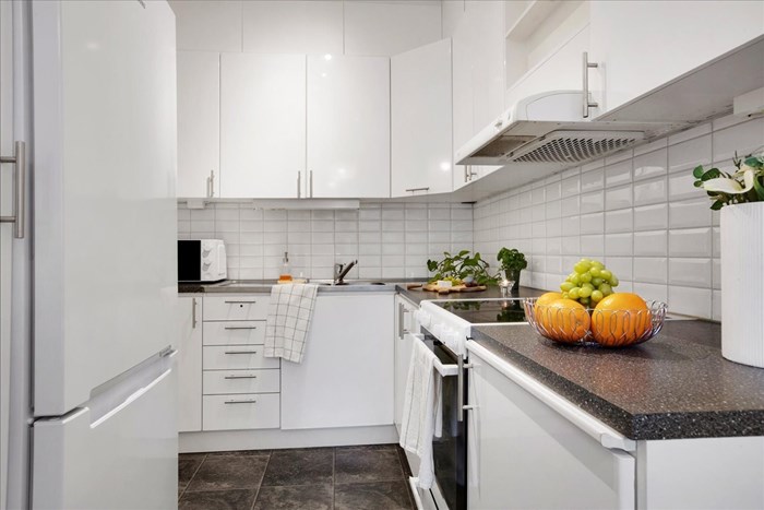 - Kaklade väggar vid diskbänk, i övrigt tapetserade. Laminatgolv. Kyl/frys, spis, spisfläkt samt diskho.