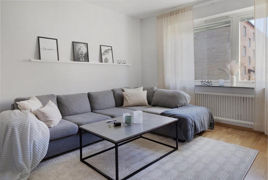 Men åter till bostaden som erbjuder genomgående parkettgolv och läckra, moderna innerdörrar vilket tillsammans med den tilltagna takhöjden skapar en härlig känsla av rymd. Vardagsrummet är otroligt lättmöblerat med plats för både devansoffan och matbord eller arbetshörna. I sovrummet finns gott om plats för en dubbelsäng utöver förvaring i de inbyggda garderoberna, vilka ingår i köpet.