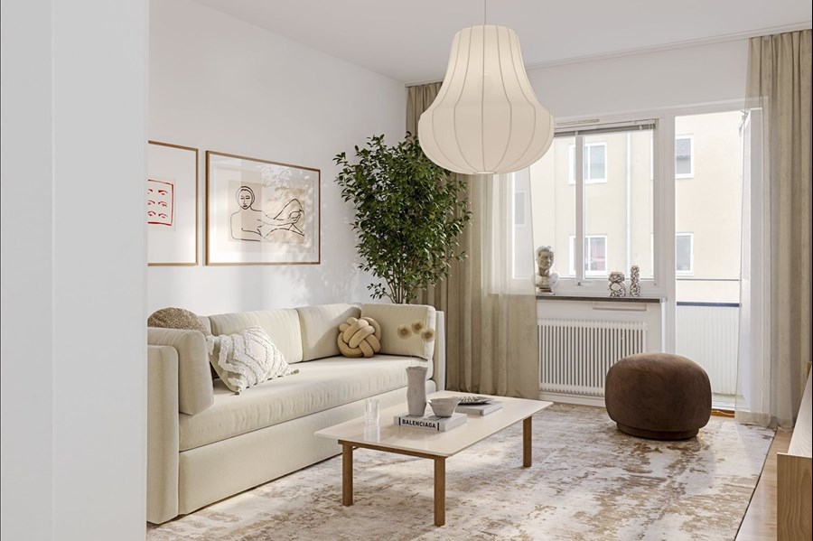 (Möbleringen i bilderna är ett fotomontage för att visa på hur det skulle kunna se ut i bostaden).