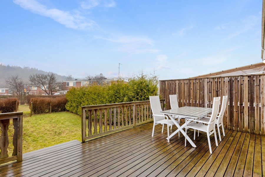 Här kan du följa solen från morgon till kväll tack vare möjlighet till uteplatser på både fram- och baksida. Framsidan (skapas av en köpare); en perfekt plats för morgonkaffet i den tidiga morgonsolen och på den härliga baksidan har ett optimalt läge med eftermiddags- och kvällssol att spendera framför grillen eller i solstolen. Härifrån har du uppsikt över den skyddade innergården med lekplats, vilket gör att barnen kan leka fritt medan du njuter av lugnet på uteplatsen med någon svalkande dryck i sommarvärmen. Det rymliga vardagsrummet flyter ihop med middagsplatsen, altanen och köket, där sistnämnda erbjuder goda arbetsytor för matlagningen såväl som bakningen.