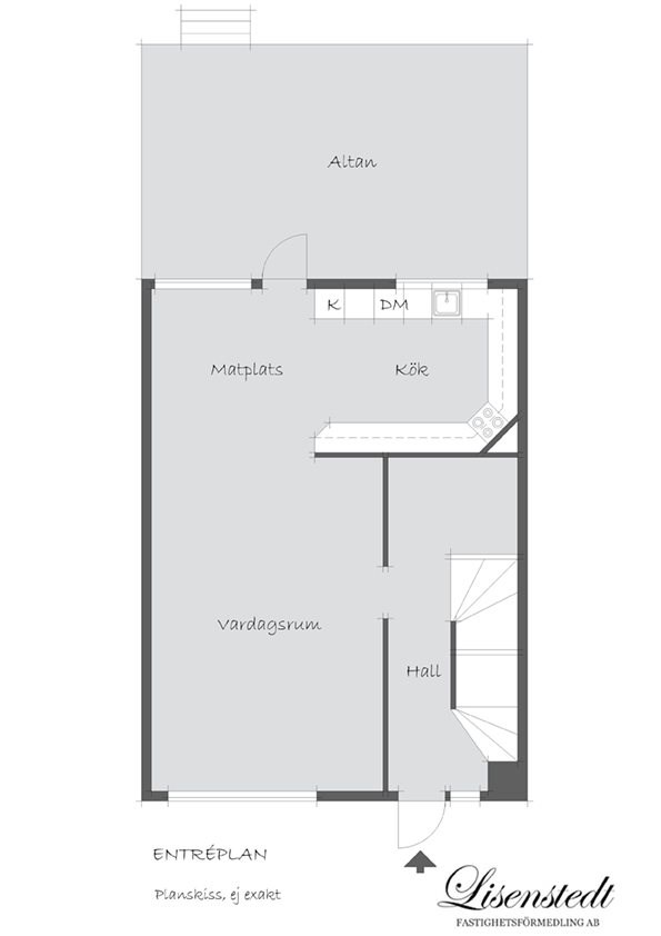 - Laminatgolv och målade tapeter. Kaklade väggar vid köksbänk. Fullhöjdskyl (frys finns i källarplan), diskmaskin, spis, spisfläkt samt diskho. Förvaring i kökslådor, köksskåp samt väggskåp.
