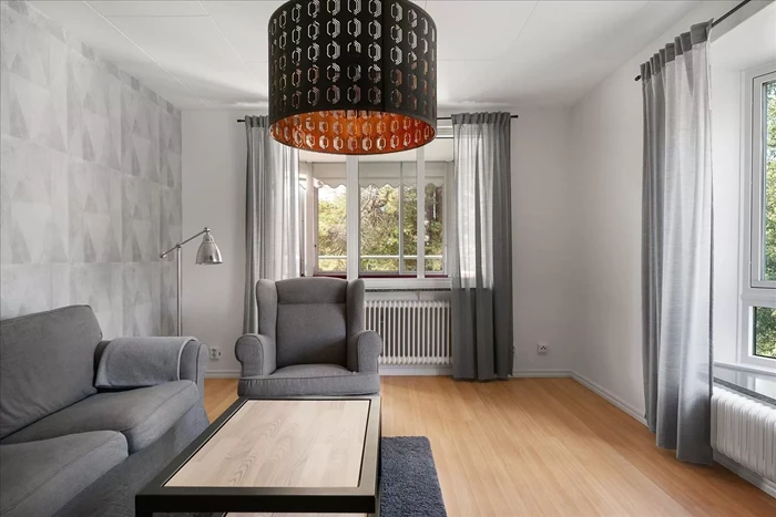 Bostadens hjärta är det trivsamma vardagsrummet som badar i ljus tack vare det vackra burspråket. Här finns gott om plats för både soffa och matgrupp – perfekt för dig som vill umgås med vänner eller bara koppla av efter en lång dag. De klassiska fönsterbrädorna i grön marmor skänker rummet en elegant och tidstypisk karaktär som harmonierar väl med byggåret 1948.